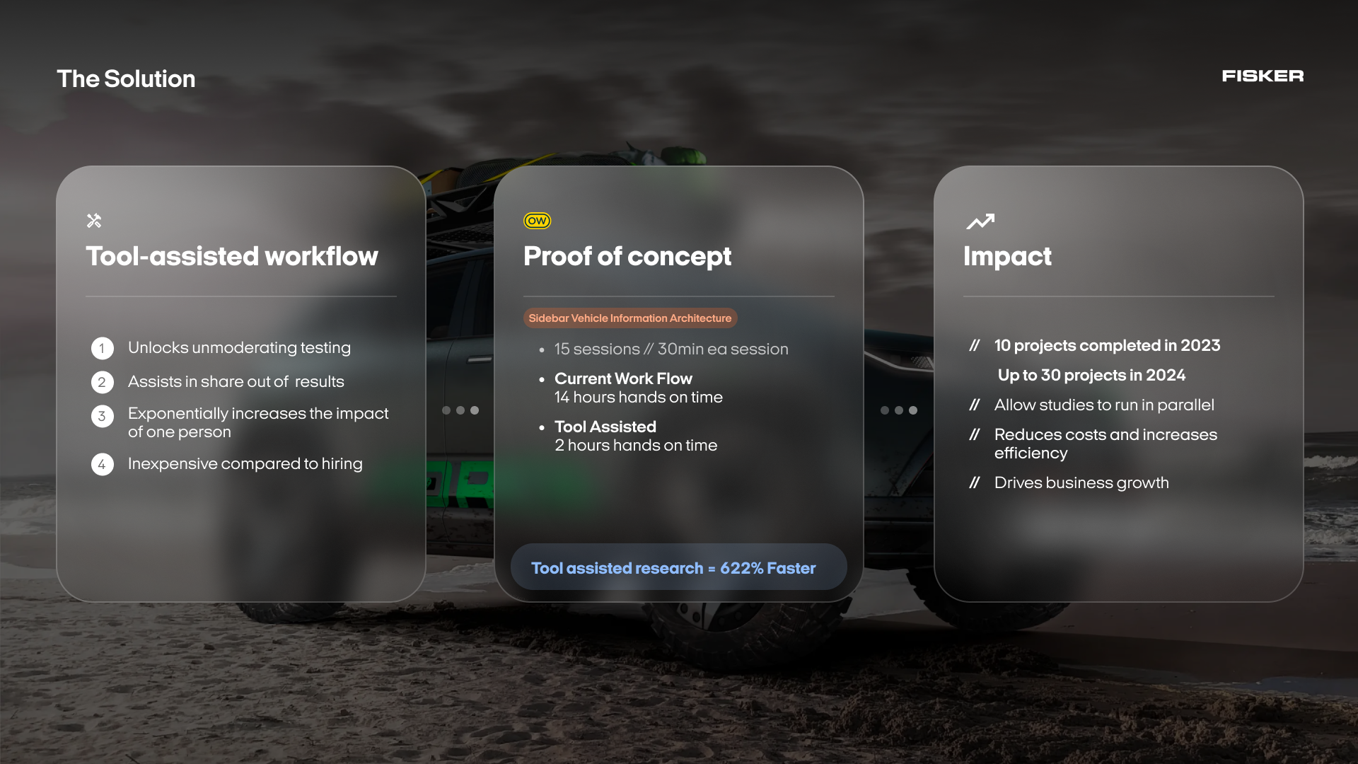 Looking back, this project was a turning point in how research was valued at Fisker. By proving the ROI of UX research, we not only amplified the voices of researchers but also embedded user insights into product decisions at scale.