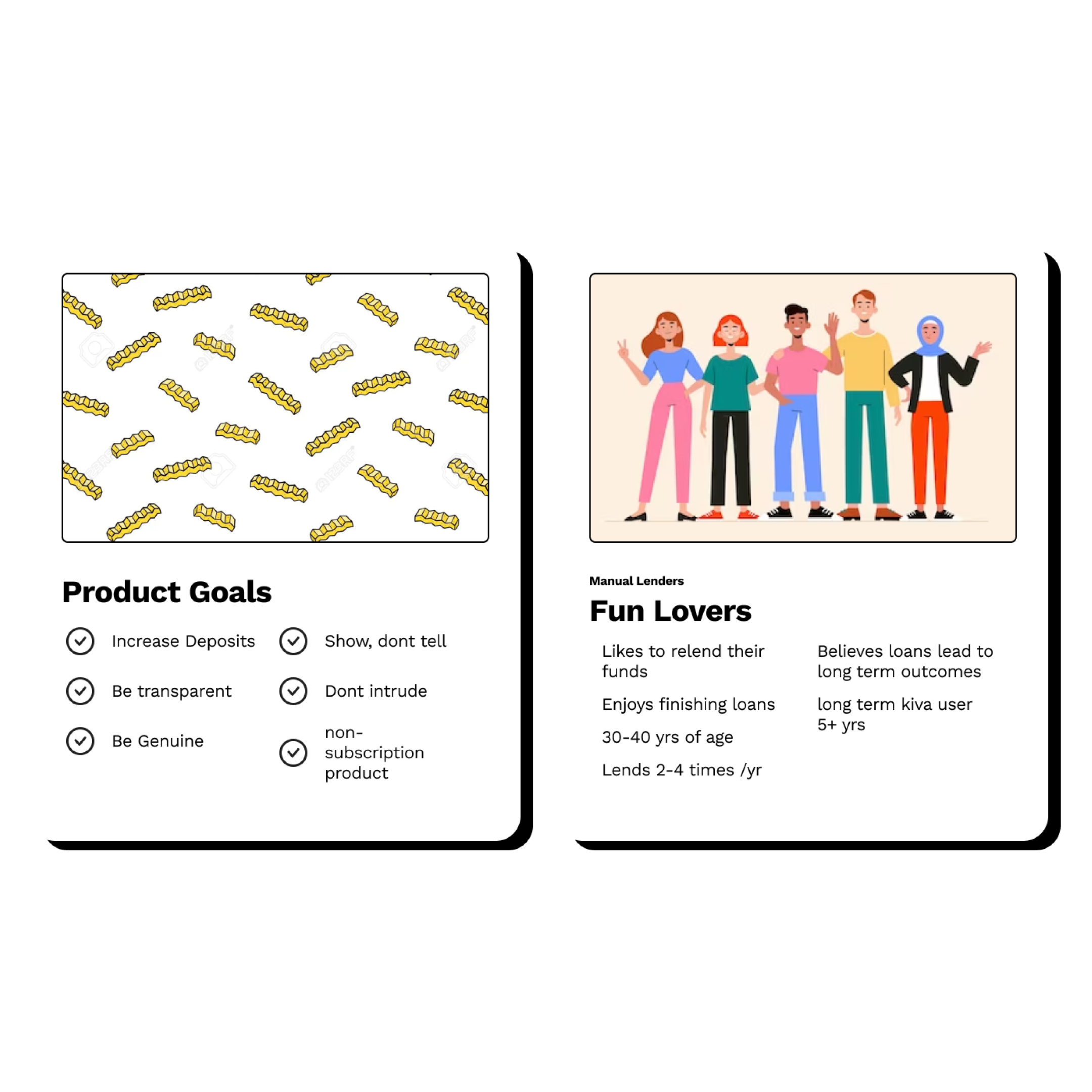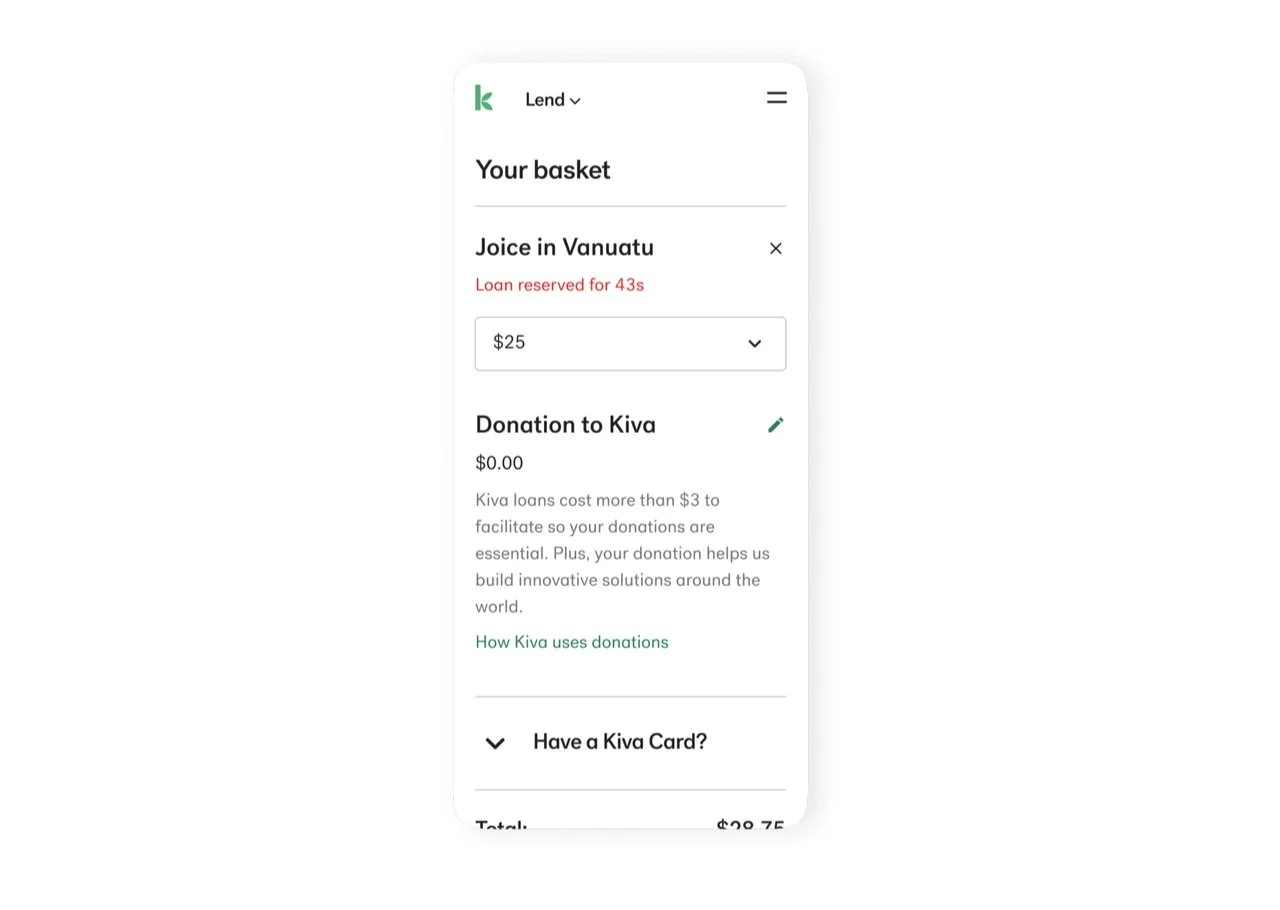 The ability to lend is what makes Kiva unique, but that creates its own set of challenges. Our lenders were not depositing new dollars and the product team saw an opportunity in the checkout experience. While the experience was fundamentally good, I was able to identify some areas of opportunity and successfully design a feature that exceeded all of our expectations. It’s currently live - add any loan to your basket to see it!